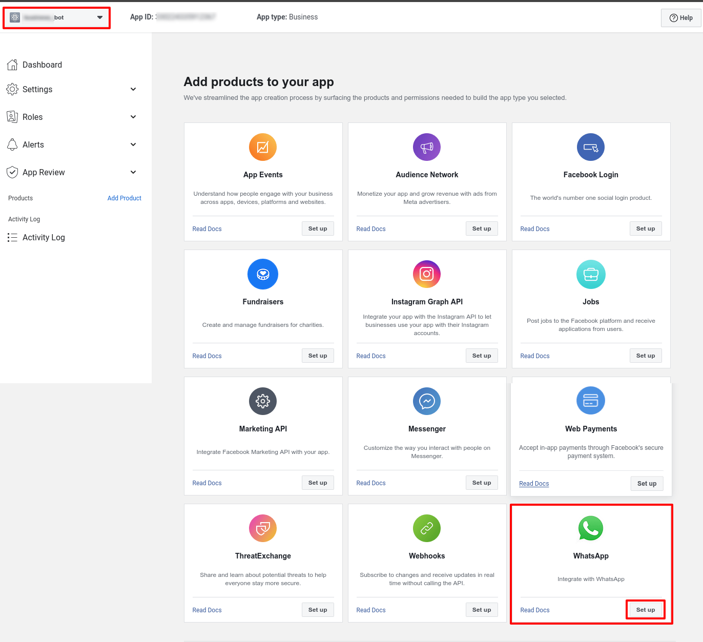 Since you will create an app for a WhatsApp business account, you have to add WhatsApp to the app.