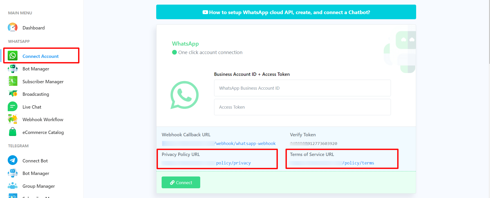 To get the callback URL and verify the token from WatiMsg Powered By Tech Orbit Solutions. Login to your account and go to the dashboard of WatiMsg Powered By Tech Orbit Solutions. At the left sidebar of the Dashboard, under the WhatsApp section, you will see connect WhatsApp option. Now click on the connect WhatsApp menu and instantly, Connect WhatsApp Business page will appear.